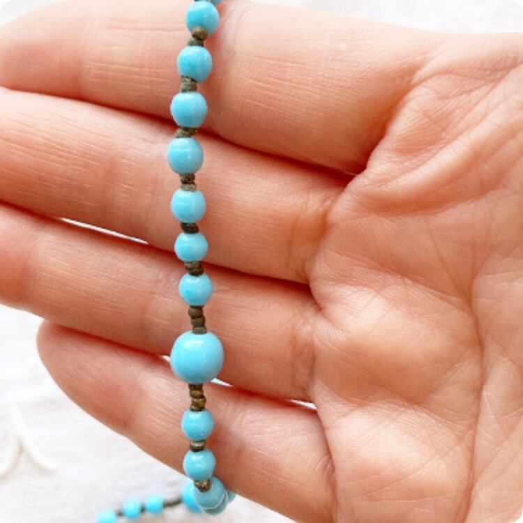 ライトブルーのビーズの色合いがとても綺麗で、アンティーク感がありとても素敵です。