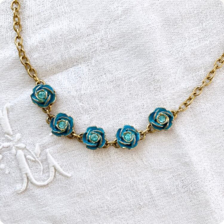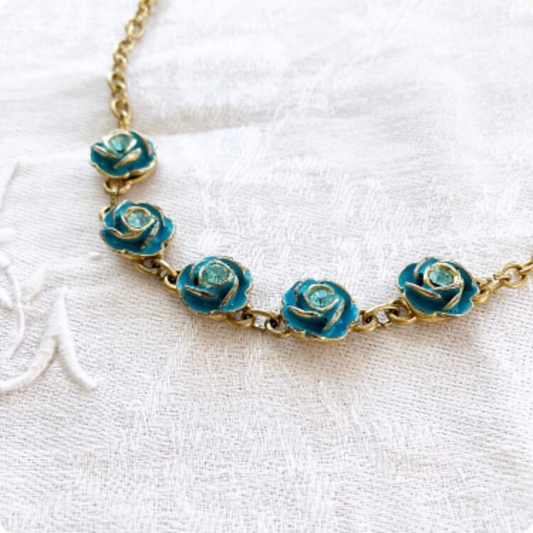 フランスから届いたばかりの、エレガントで上品なブルーローズのモチーフのヴィンテージネックレスです。