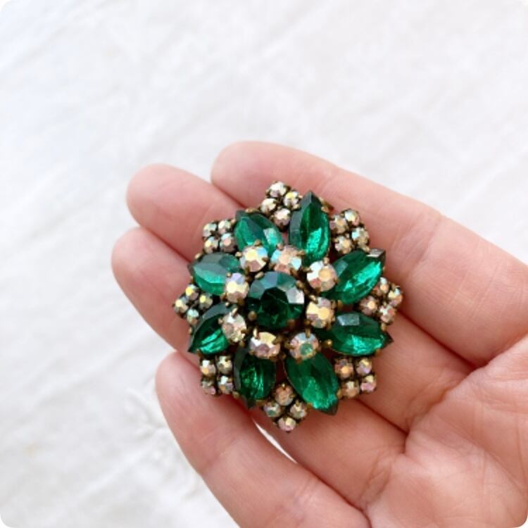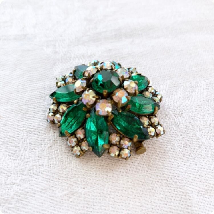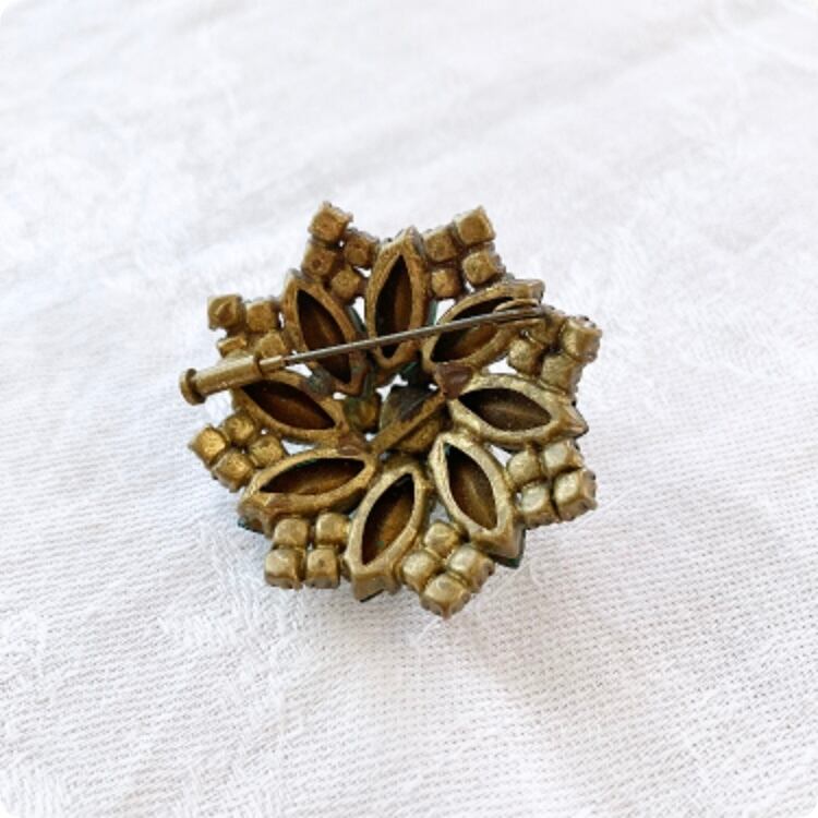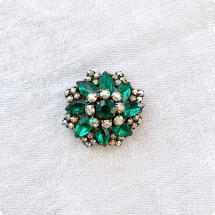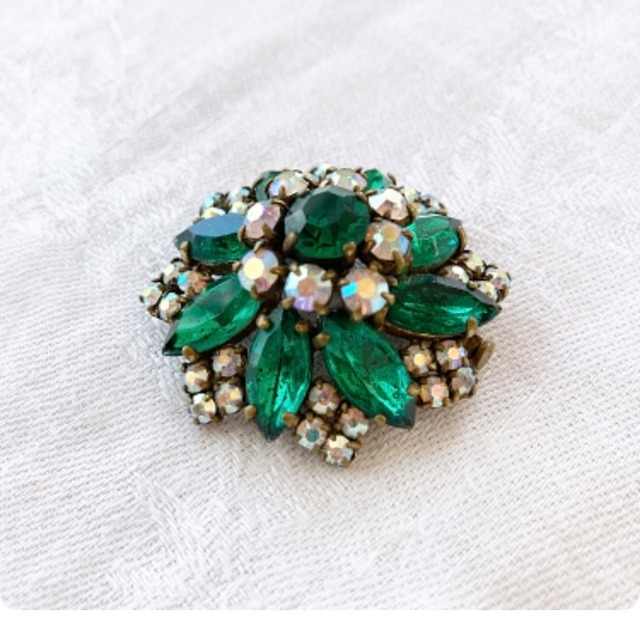 【フランス直輸入】華やかさ際だつ シャイニーグリーン ヴィンテージブローチ
