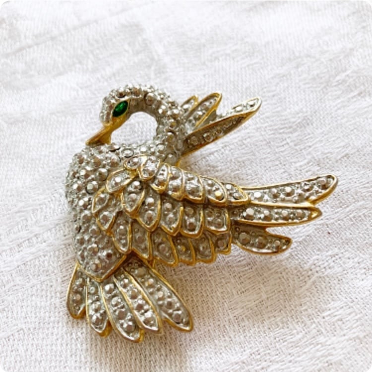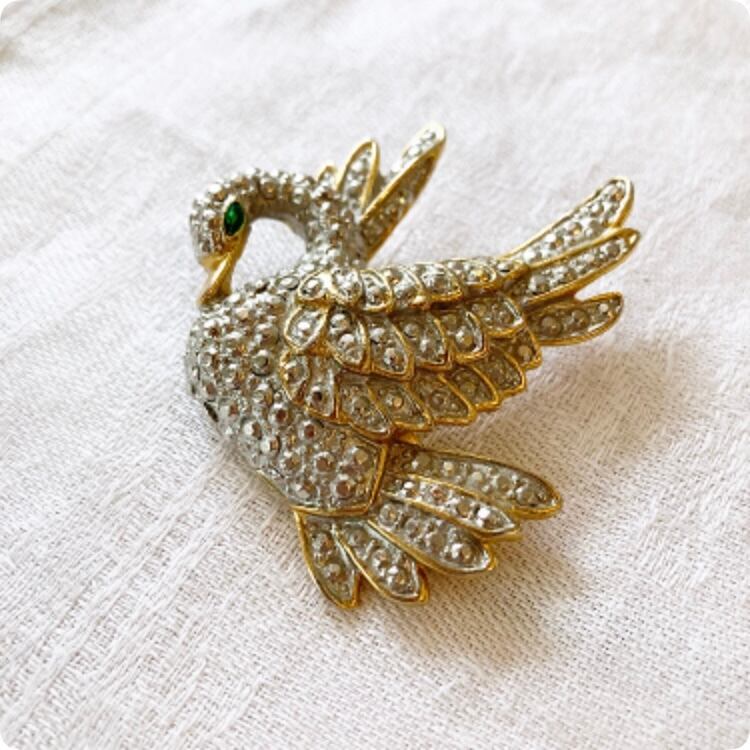 フランスから届いたばかりの、グリーンカラーの瞳が魅力的な白鳥モチーフのヴィンテージブローチです。