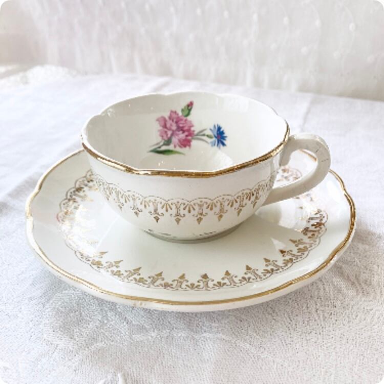 フランスから届いたピンクとブルーのお花が描かれた、愛らしいカップ&ソーサーです。