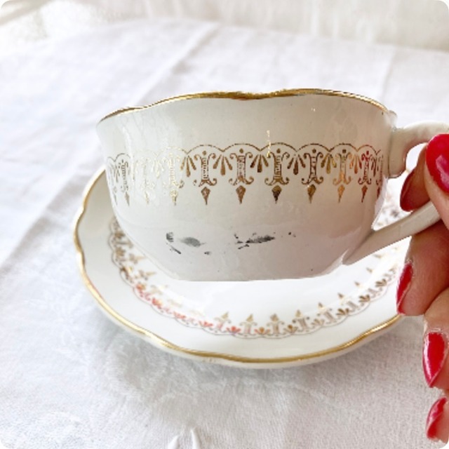 特筆するような大きな欠けやキズなどのダメージはございません。カップの表面に黒い汚れが見受けられます。泡ハイターでもしかしたら薄くなるかもしれませんが、入手した状態で発送させていただきますね。その分お値段に反映させていただいております。金彩は比較的残っている方かと思います。ソーサーも裏面に薄っすらとグレーのシミにみえるような箇所がございます。いずれも気になる程度ではございませんが、感じ方には個人差がございますので画像をよくご覧になってからご購入ください。いずれもアンティークならではの風合いと感じていただけますと幸いです。