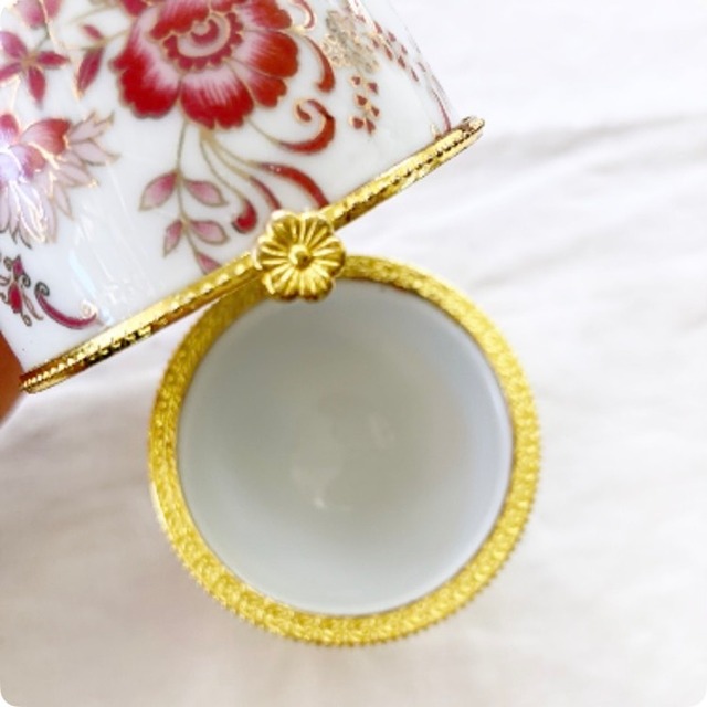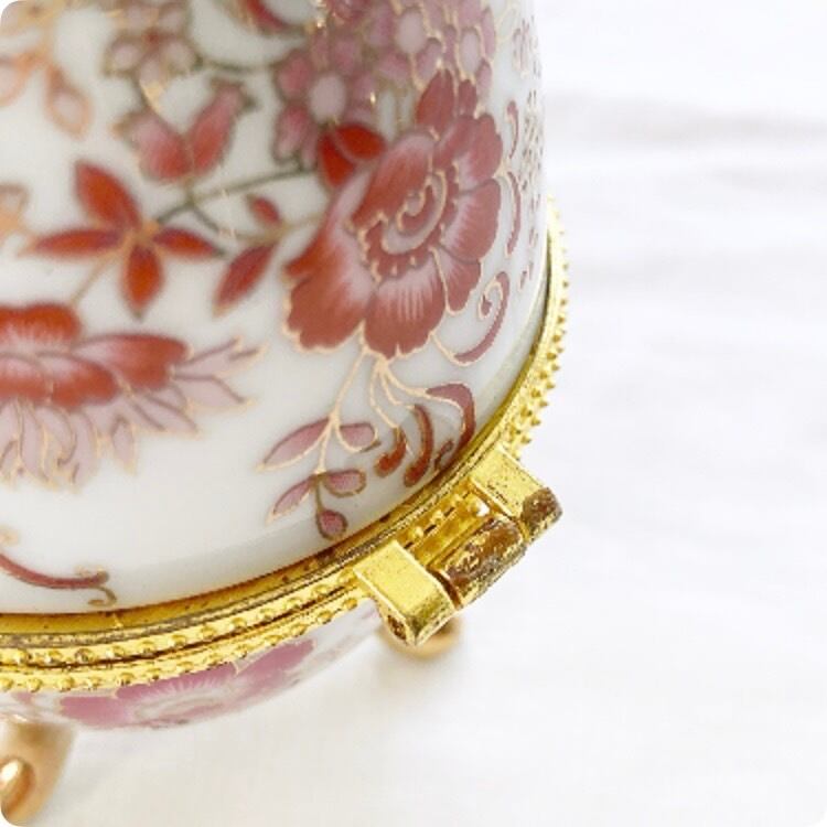 フランス直輸入のヴィンテージ小物入れは、ピンクとゴールドの色合いが華やかに響き合う、まさに一目惚れする美しいアイテムです。