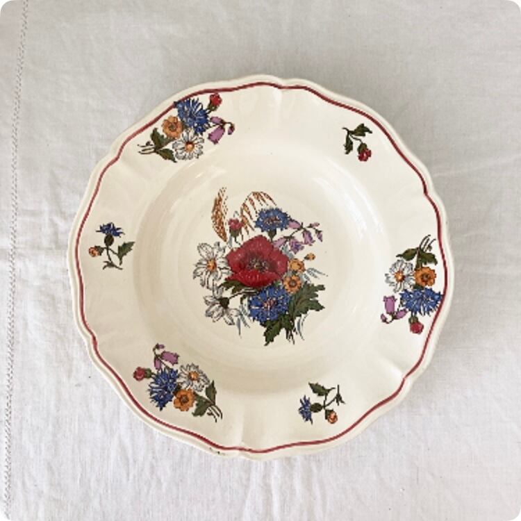 ノスタルジックな色合いに色とりどりのお花が描かれた、フランス直輸入のサルグミンヌスープ皿です。