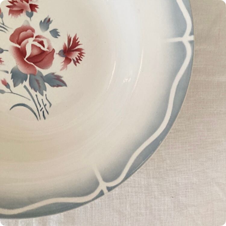 こちらのサルグミンヌ スープ皿は、くすみブルーに映える赤いお花が特徴的で、懐かしさと愛らしさが共存する美しいデザインです。