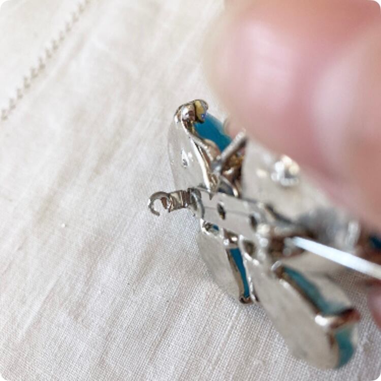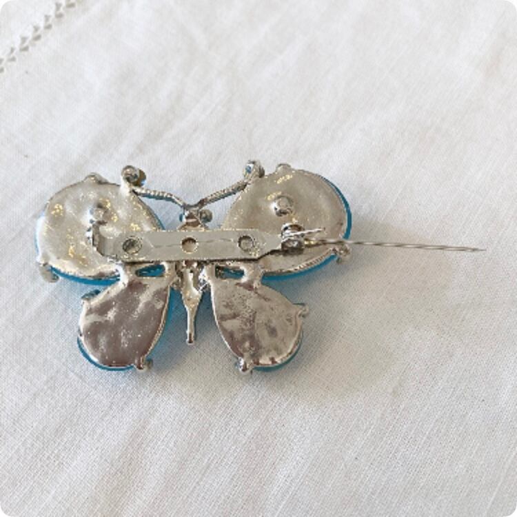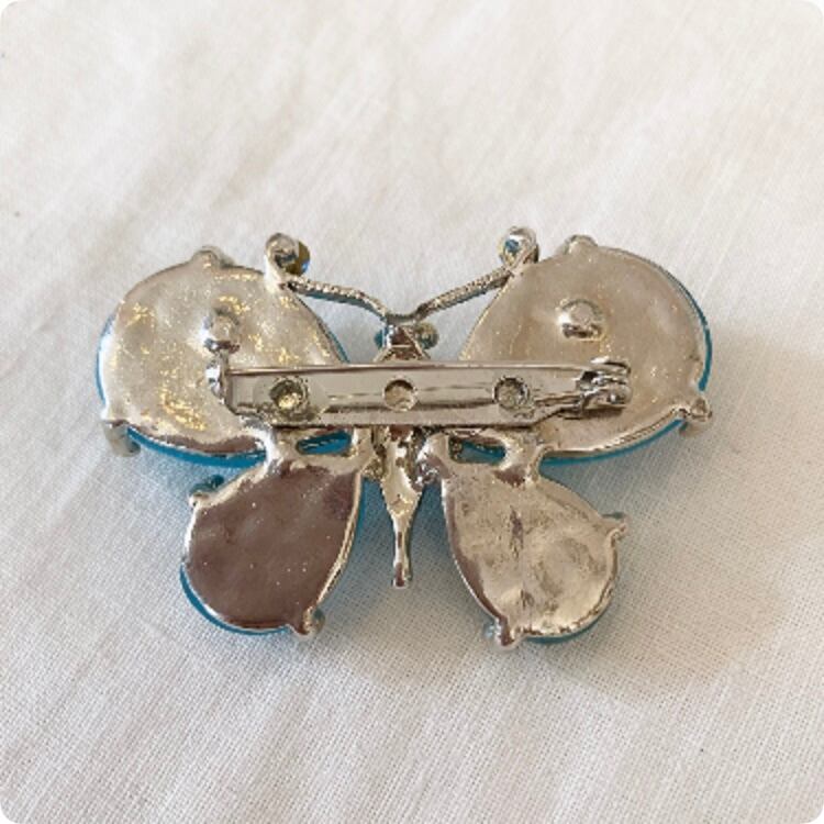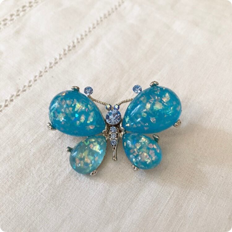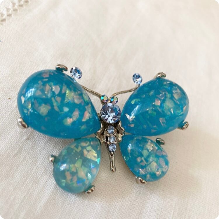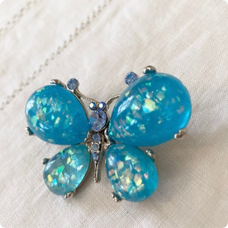 目を奪われる鮮やかなブルーが魅力的な妖艶なバタフライモチーフのヴィンテージブローチです。