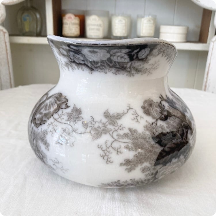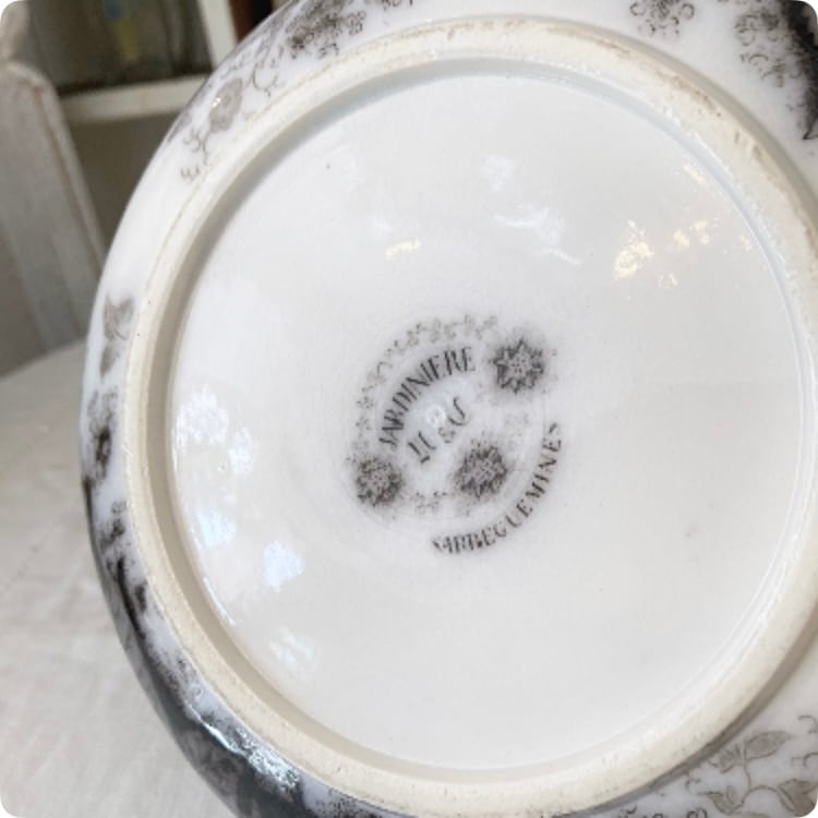 サルグミンヌ(Sarreguemines)のジャルディニエール(Jardiniere)は、白地に描かれた黒い花柄が特徴的で、トランスファーウェアという技法が使われています。
