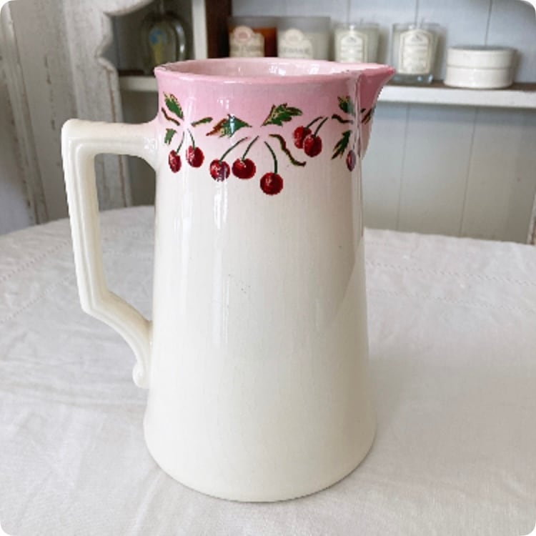 このシンプルなフォルムとチェリー柄が可愛らしいヴィンテージピシェは、グラデーションのピンクが優しく、どんなテーブルセッティングにも合う一品です。
