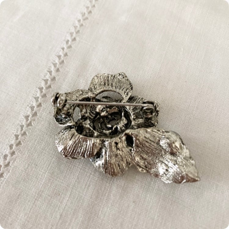 このヴィンテージブローチは、グレーカラーの美しい薔薇をモチーフにしたデザインが特徴です。