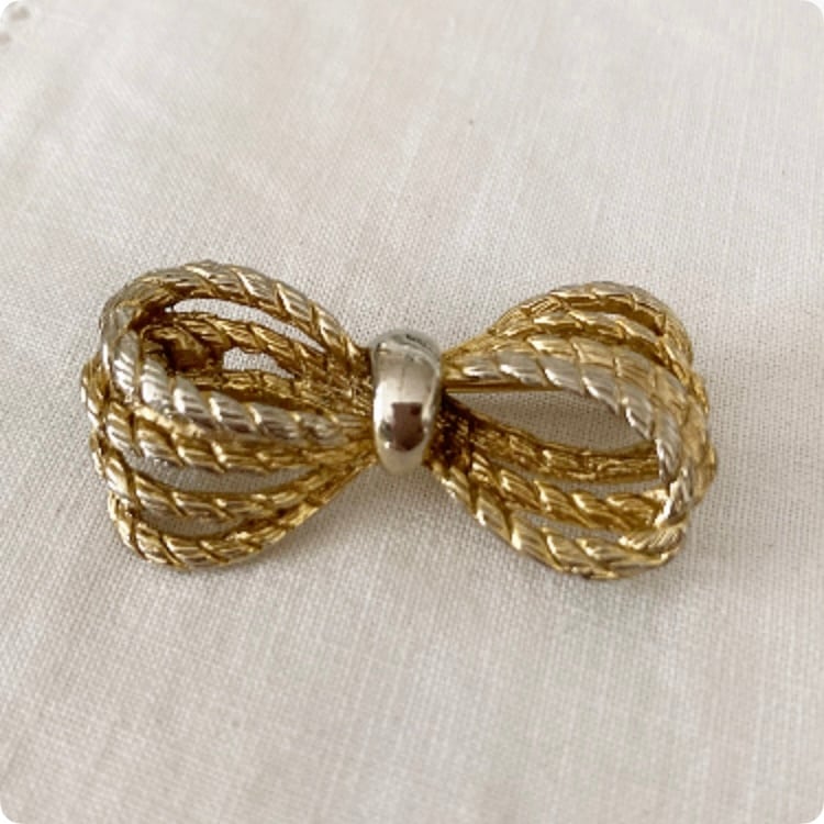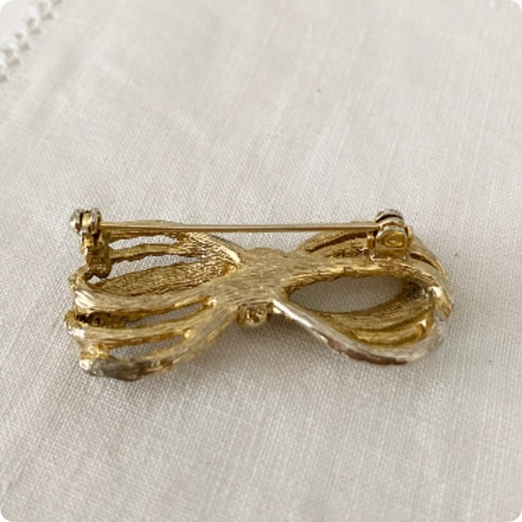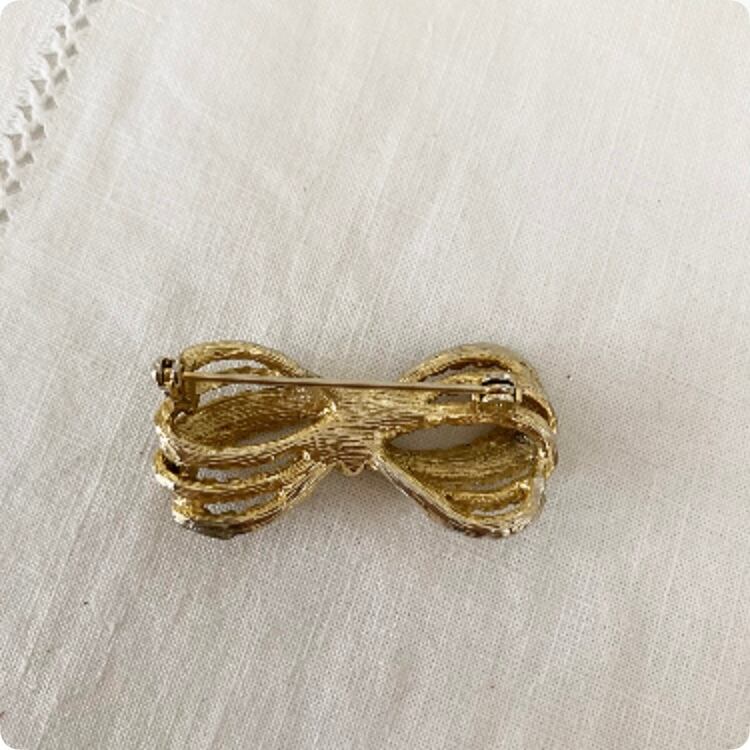 リボンをモチーフにしたこのヴィンテージブローチは、細部にまで手の込んだデザインが特徴で、上品かつ可愛らしい印象を与えてくれます。