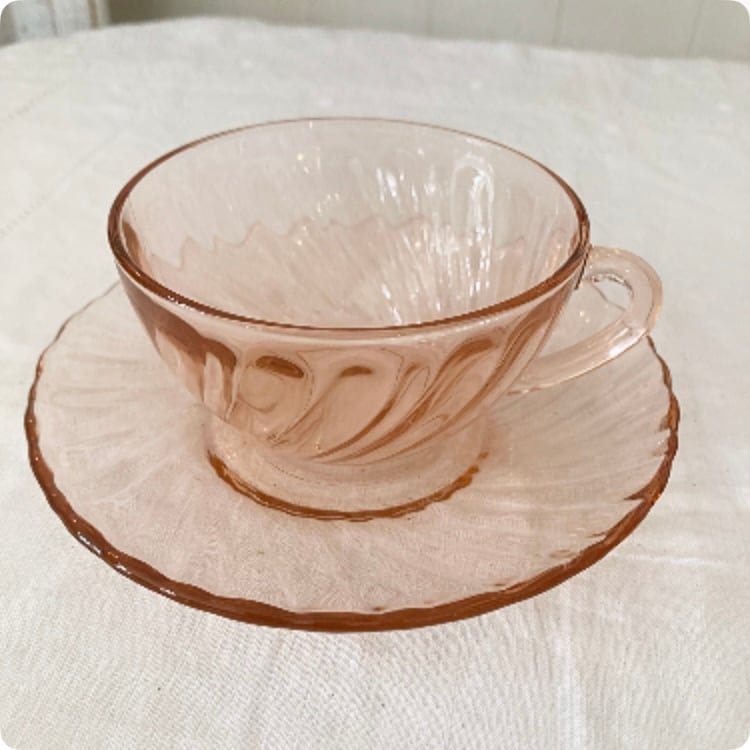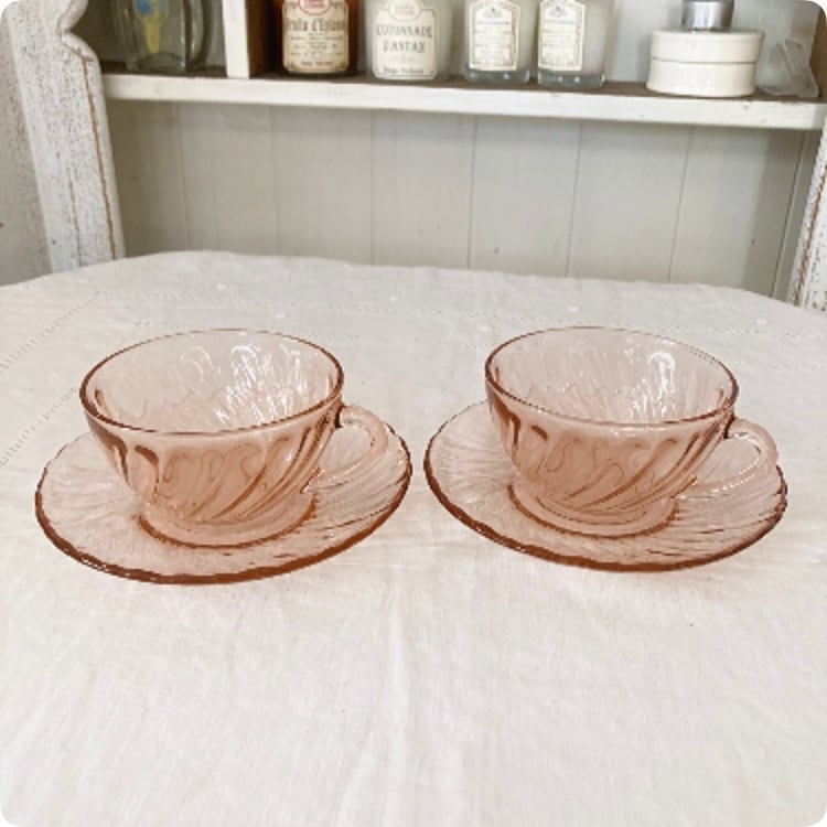 【フランス直輸入】心くすぐるやわらかなピンクガラス アルコロック ヴィンテージ カップ&ソーサー