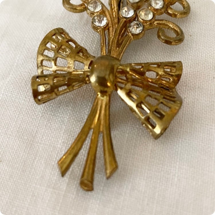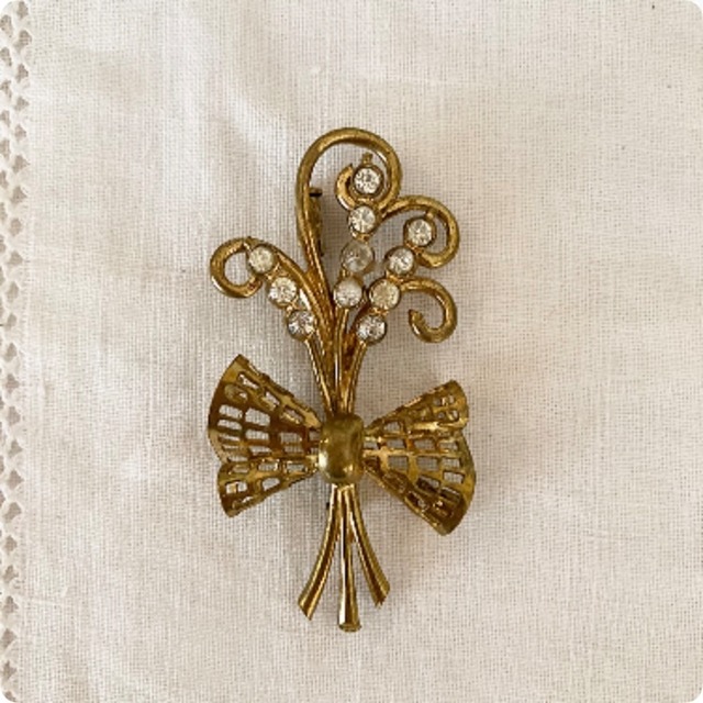 【フランス直輸入】リボンや花束のモチーフが愛らしい アンティーク ゴールド ブローチ