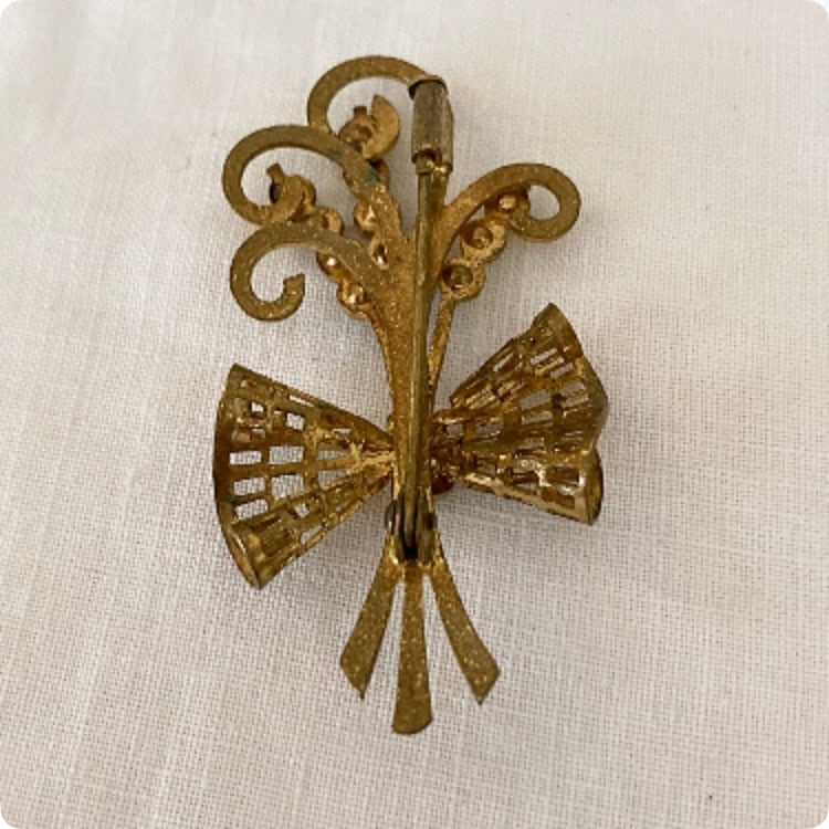 このブローチは、リボンや花束のモチーフが施された凝ったデザインが特徴で、どこか優雅さを感じさせます。