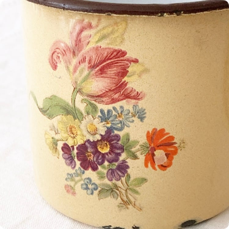 愛らしい花柄が施されたヴィンテージホーロー製マグカップです。