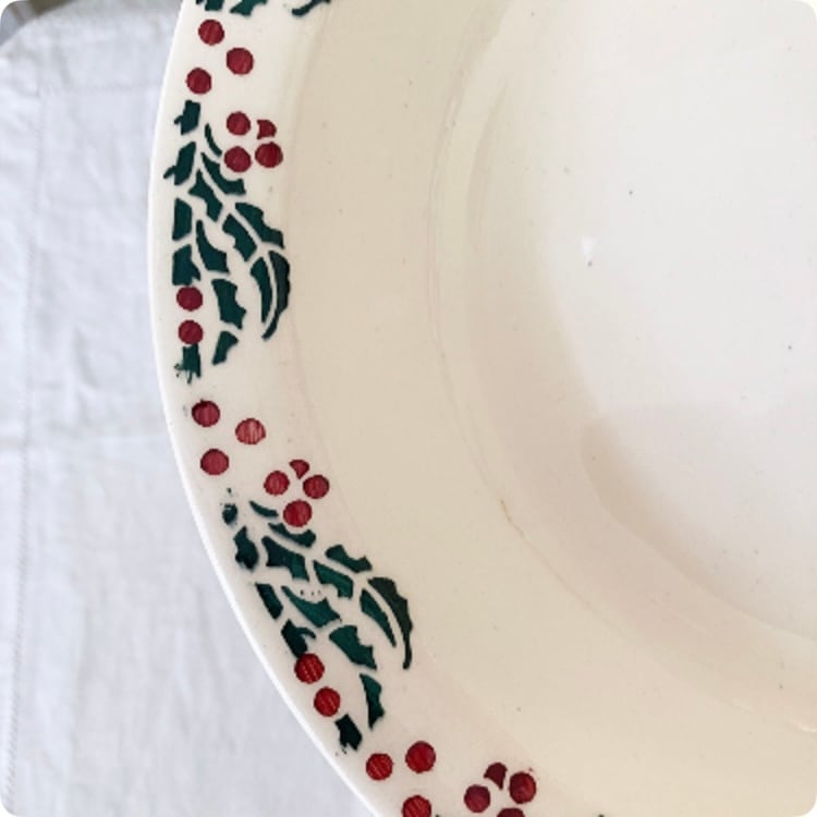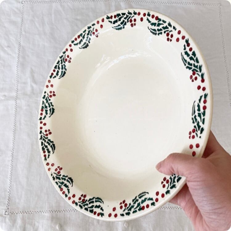 「HOUX」ヒイラギ柄のアンティーク深皿は、クリスマスのムードを一層引き立てます。