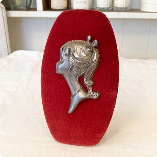 【フランス直輸入】華やかな赤のヴェルベットにピューター製の少女の顔が引き立つ ヴィンテージ 飾り絵