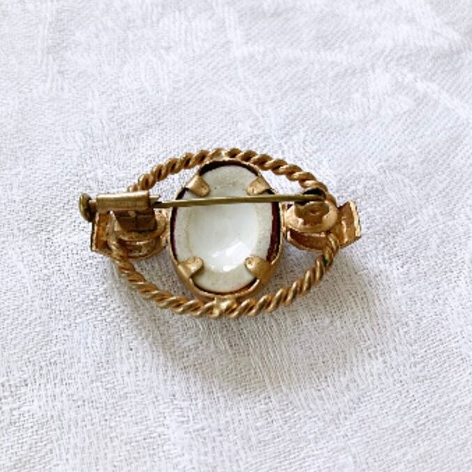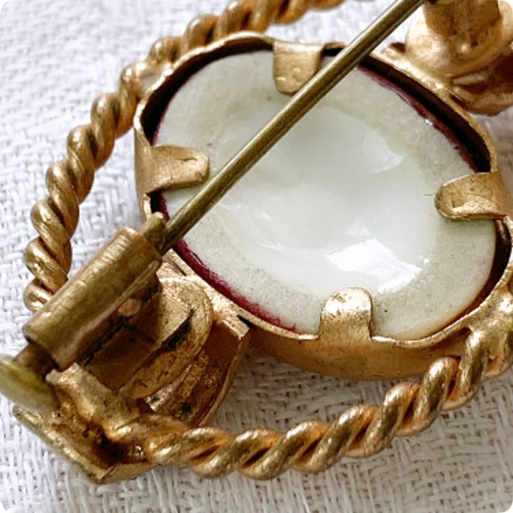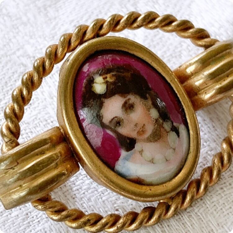 ■エレガントな微笑を引き立てる、貴婦人の陶器と真鍮のヴィンテージブローチ