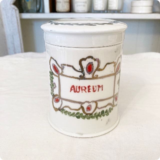 金彩やグリーンの植物が描かれた「AUREM」(黄金)アンティーク 薬瓶(キャニスター)です。
