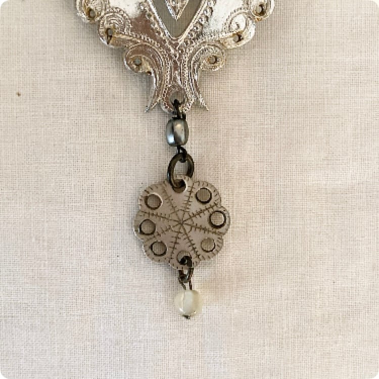 ハートと十字架のモチーフが印象的で、特に縦長のデザインが絶妙に揺れ動き、存在感を引き立てます。