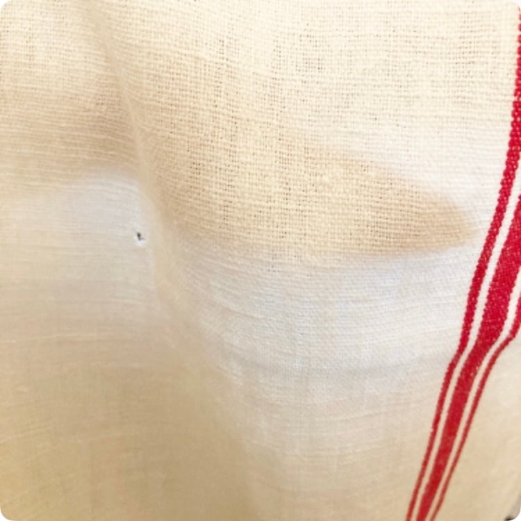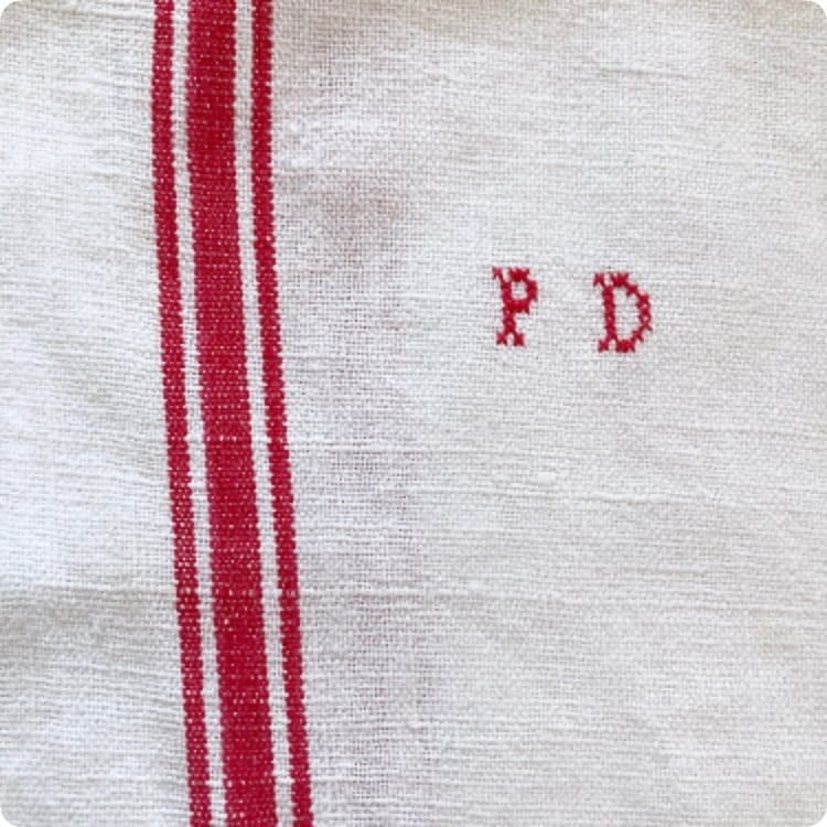 このトルションは、赤いラインと刺繍のシンプルで洗練された印象のキッチンクロスです。