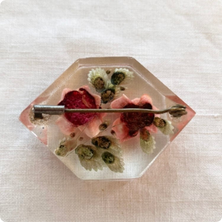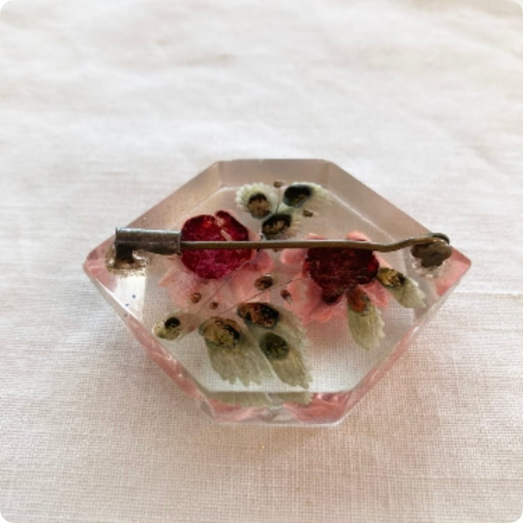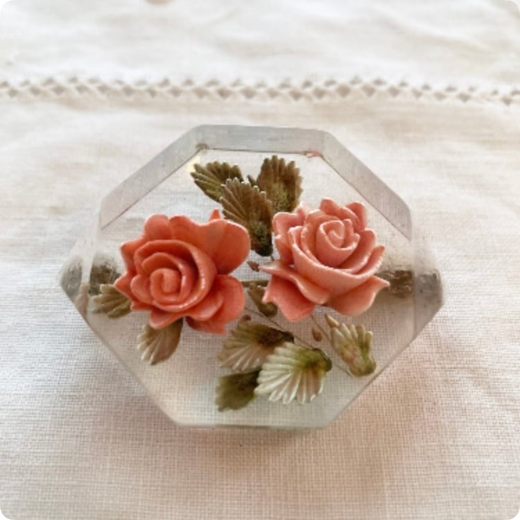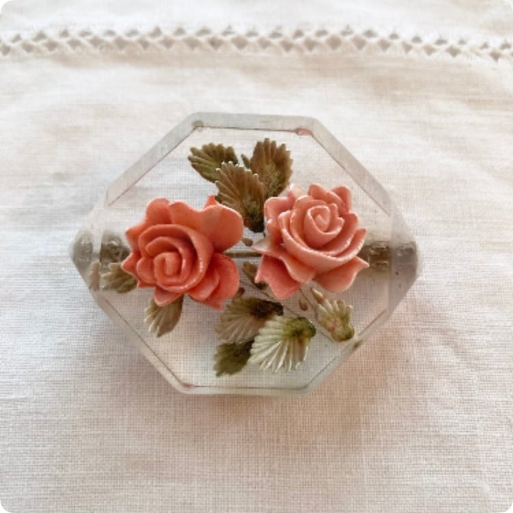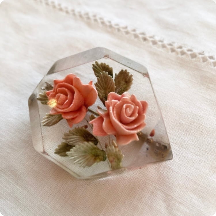 【フランス直輸入】 ピンク色の薔薇が美しい ルーサイト ヴィンテージブローチ