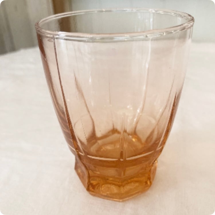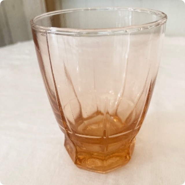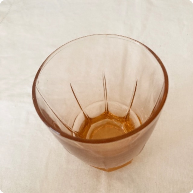 フランスから買付けた、愛らしいピンク系のアンバーガラス製のリキュールグラスです。