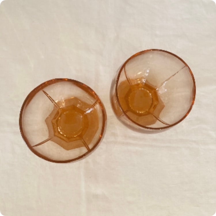 フランスから買付けた、愛らしいピンク系のアンバーガラス製のグラスです。
