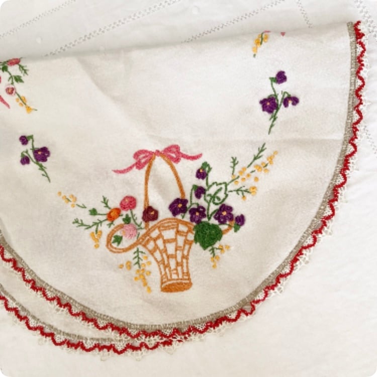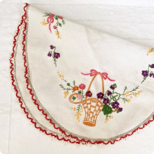 愛らしいピンクのリボンとフラワーバスケットの手刺繍が施されたヴィンテージオーバル型のテーブルクロスです。