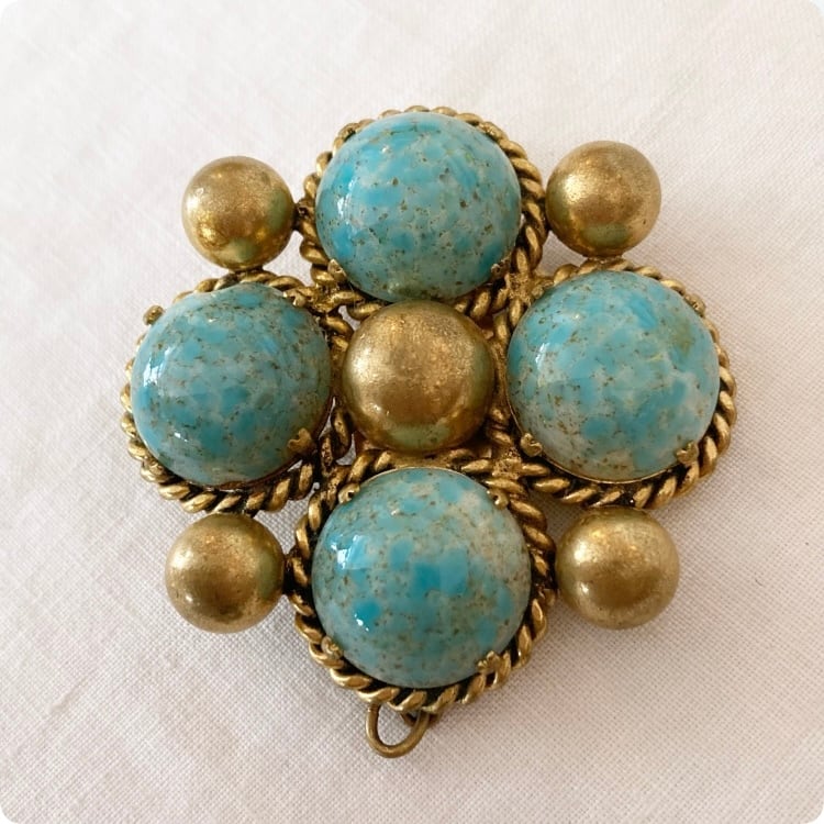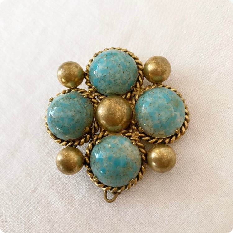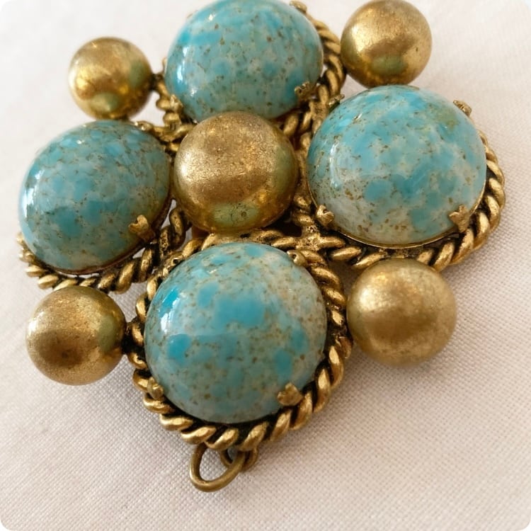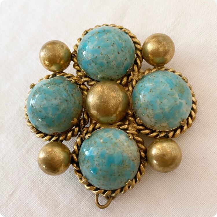 フランスから買付けた、大ぶりで目を引くターコイズカラーのヴィンテージブローチです。