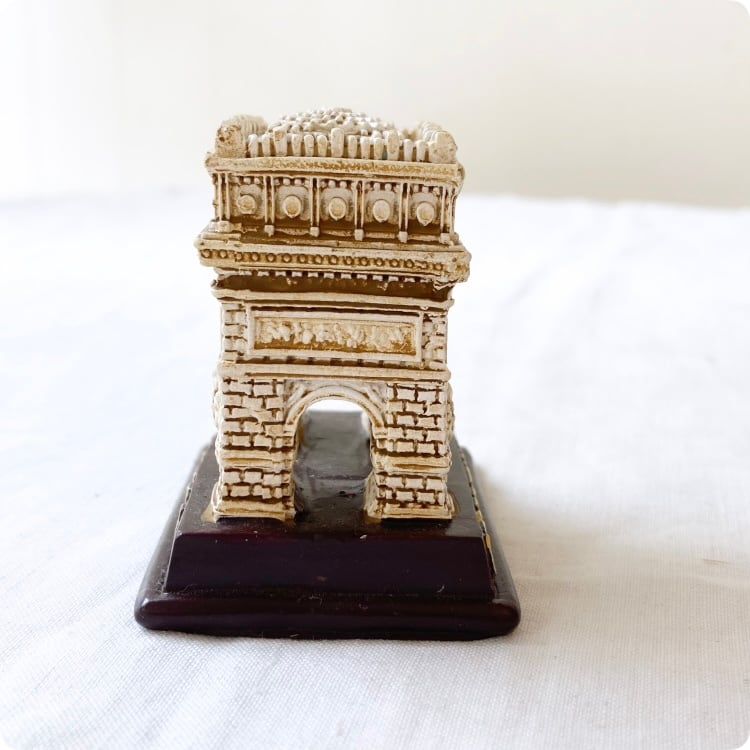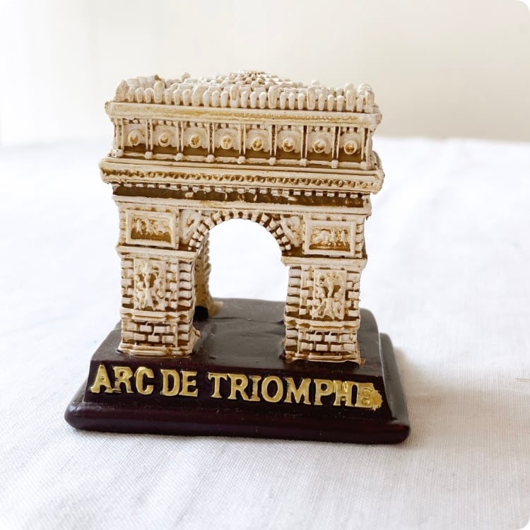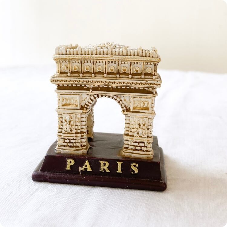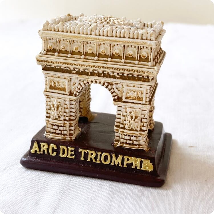 レジン製の軽やかな色合いと、細部まで表現されたデザインは、手のひらサイズながらも存在感があり、まるで凱旋門そのものを思わせる佇まい。