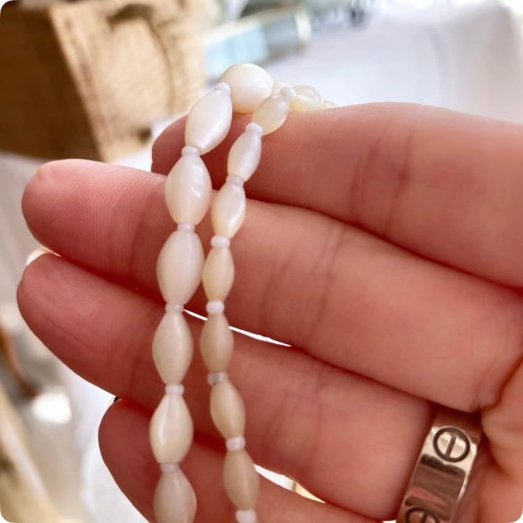 このマザーオブパールのビーズネックレスは、自然で美しいアイボリーカラーが特徴で、どんなスタイルにも合わせやすいアイテムです。