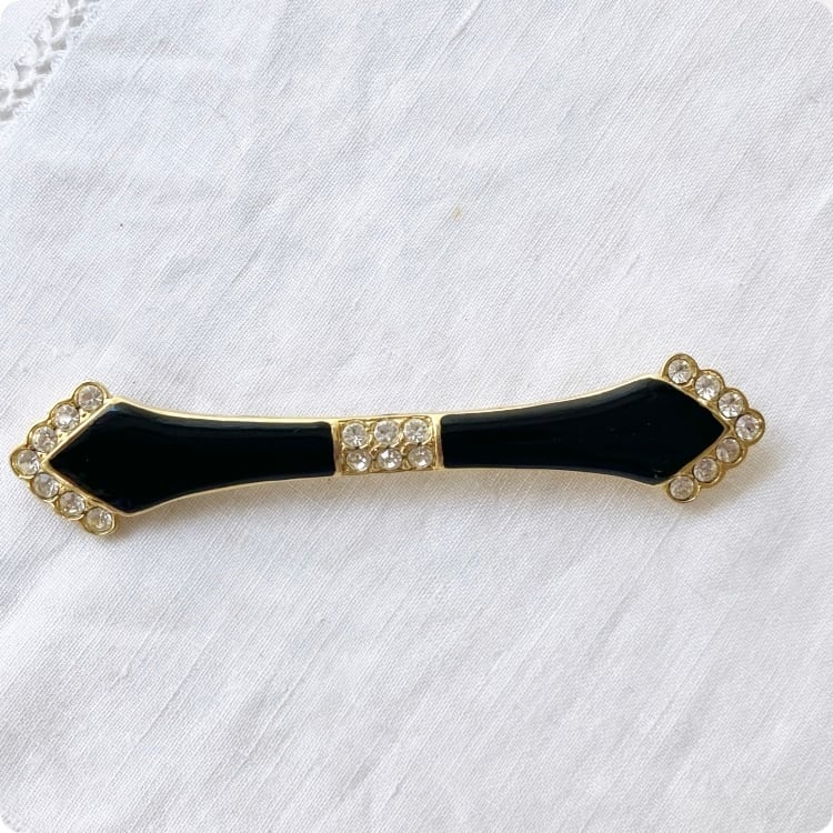 アールデコ調の洗練されたデザインが特徴的なこのブローチは、シックな黒のエナメルと華やかなゴールドトーンがとても素敵です。