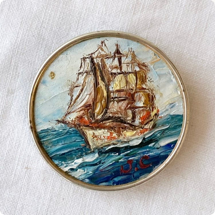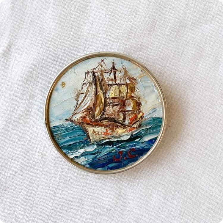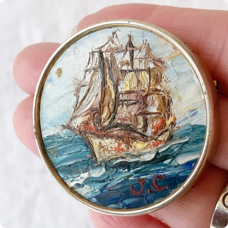 フランスヴィンテージ ブローチ |手書きの帆船 油絵 印象派|1900年代中頃