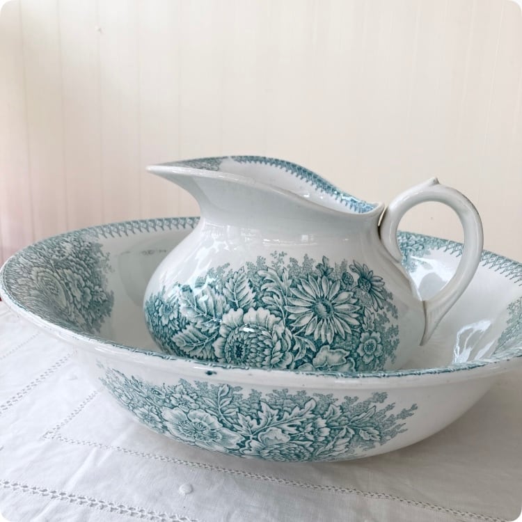 昔、水道がとおっていない時代、こんな風に水差しと洗面器の組み合わせで使われていたものです。