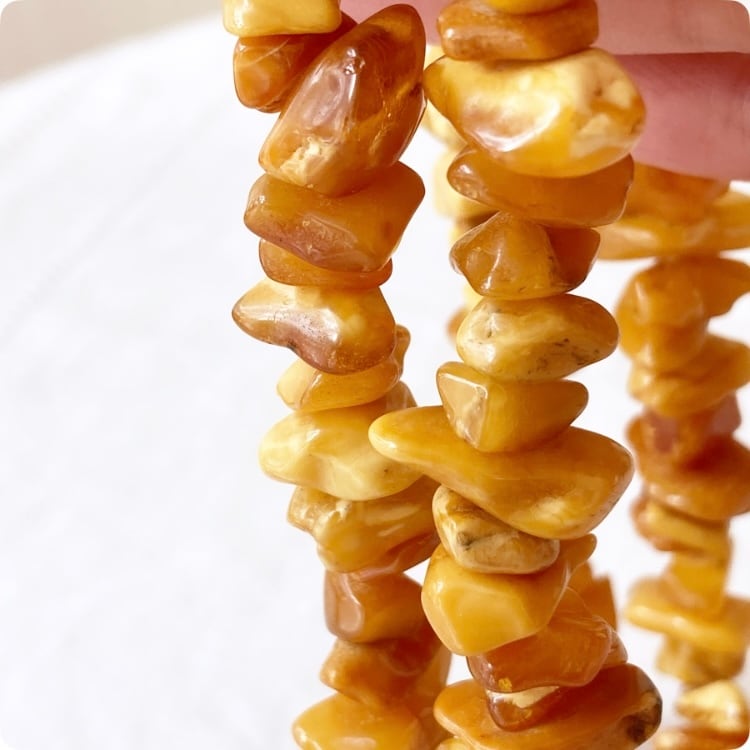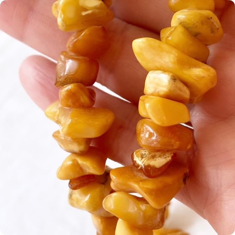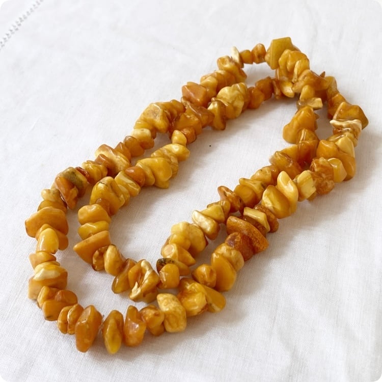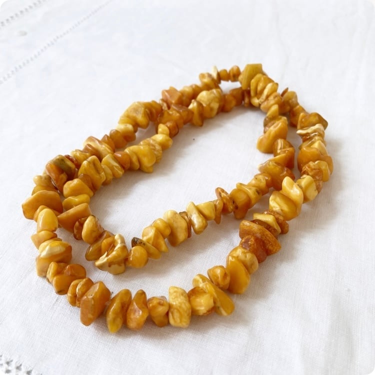 天然の琥珀から作られたチップネックレスで、マスタードイエローカラーの美しい色合いが特徴です。