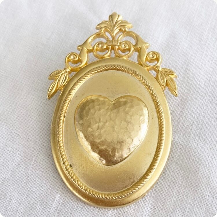 このブローチは、品の良いゴールドカラーが特徴で、愛らしいハートモチーフがどんなスタイルにも華やかさを添えてくれます。