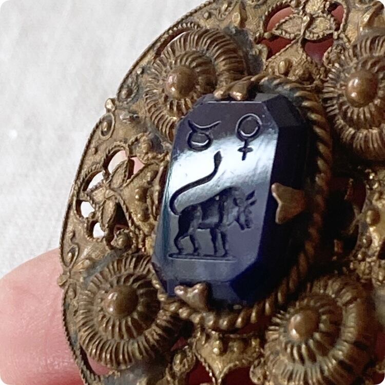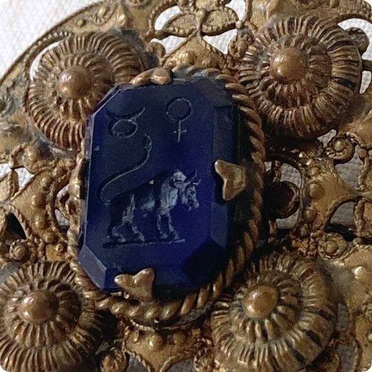 このブローチは、牡牛座と金星をテーマにしたデザインが特徴で、青いガラスと真鍮製の豪華な透かし細工が目を引きます。