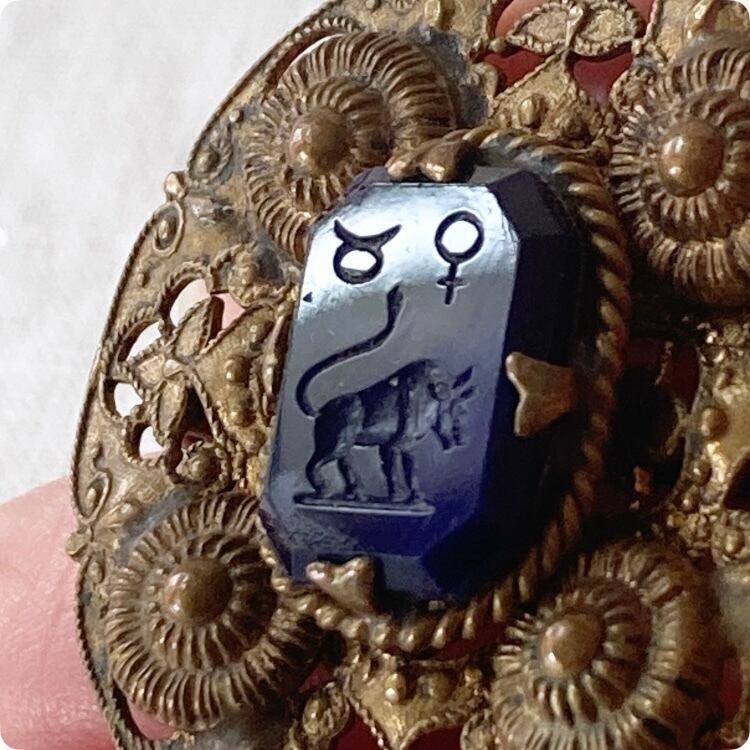 フランスヴィンテージ ブローチ |牡牛座 ×金星 青ガラス 真鍮製 |1900年代中頃~後半