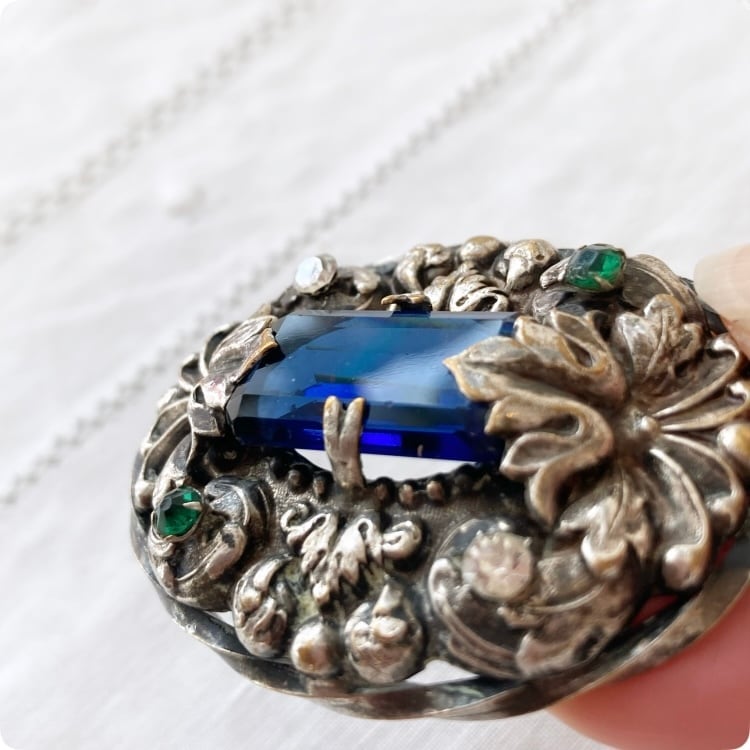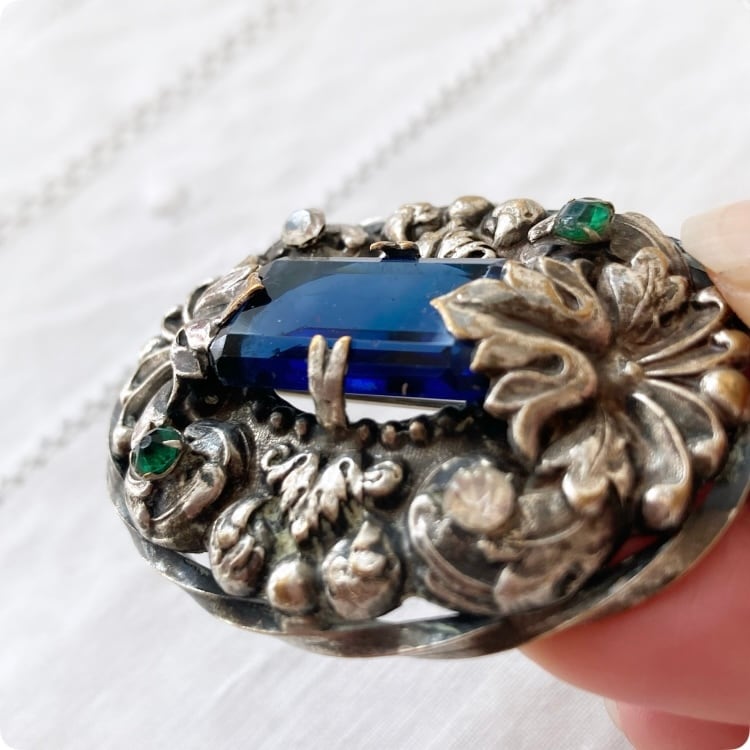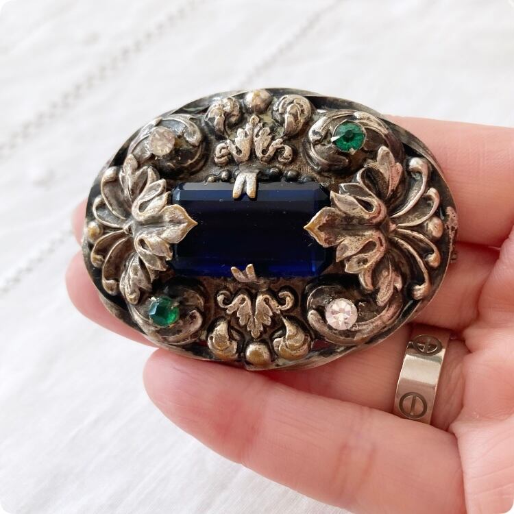 このブローチは、大粒のサファイアブルーガラスが目を引く存在感のあるデザインが特徴です。
