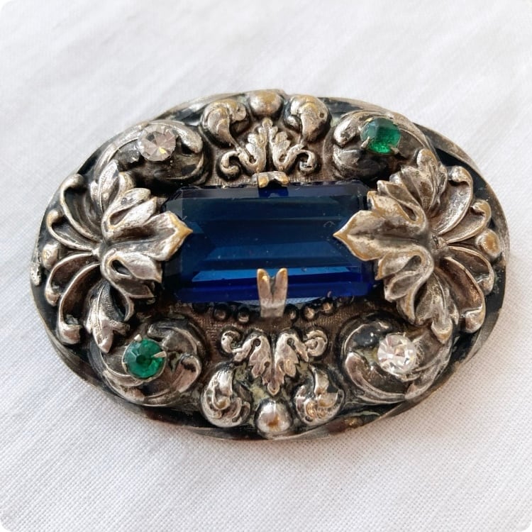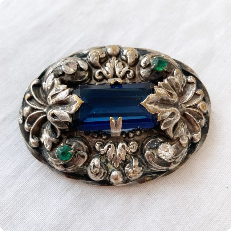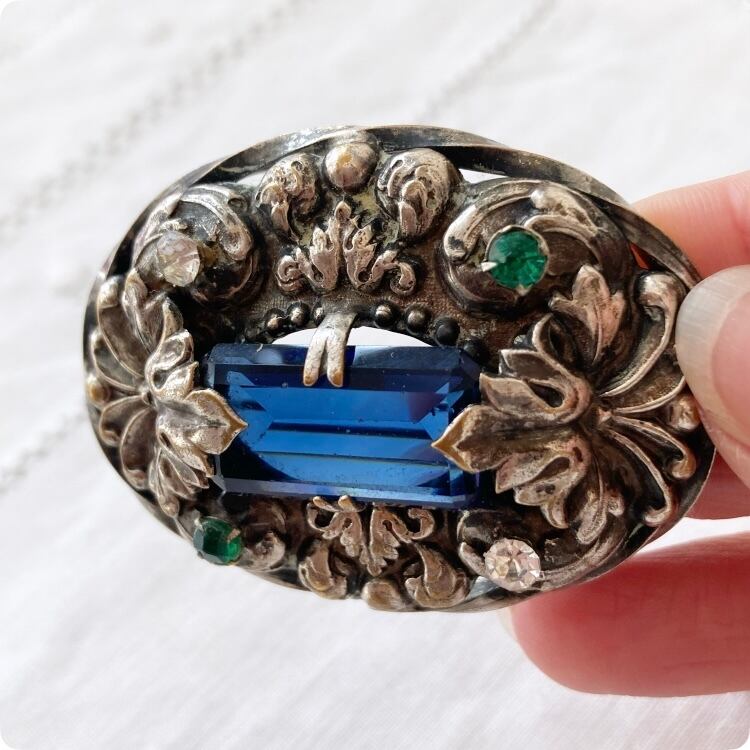 フランスヴィンテージ ブローチ | 大粒のサファイアブルーガラス コスチュームジュエリー |1930-50年代