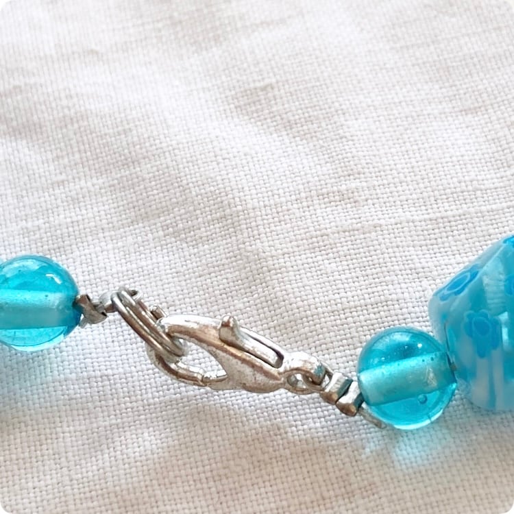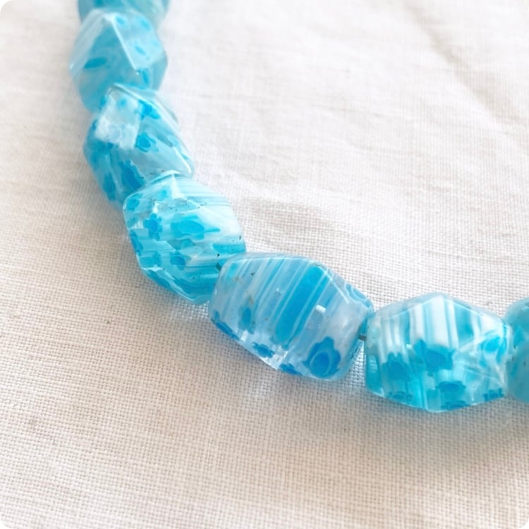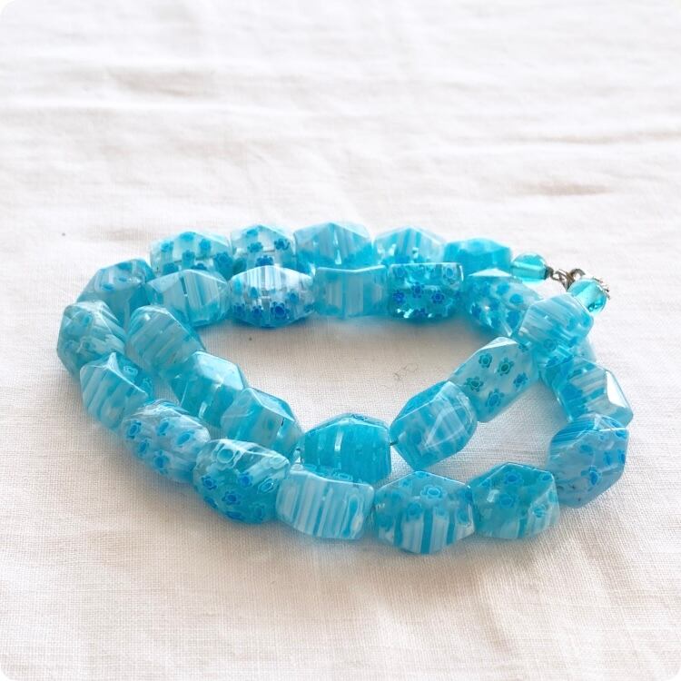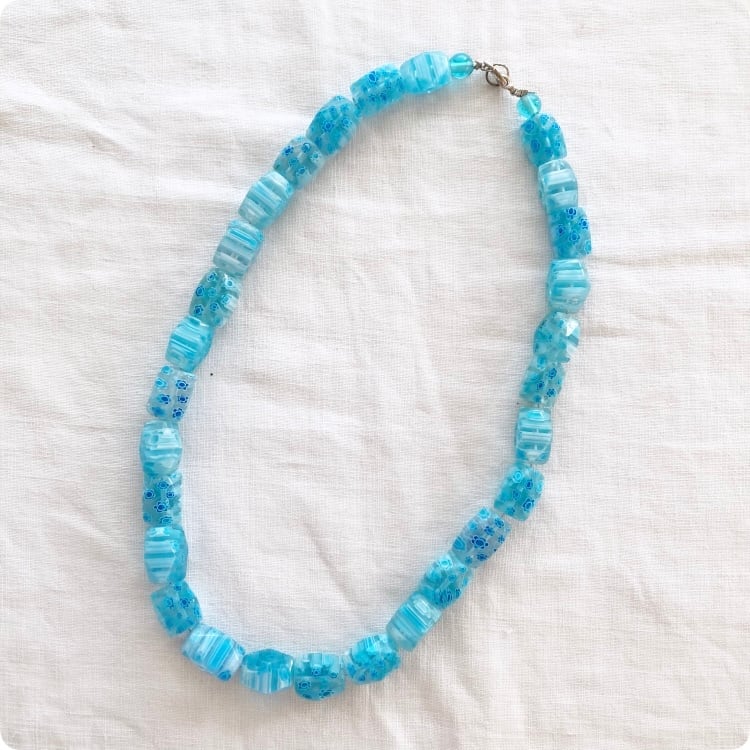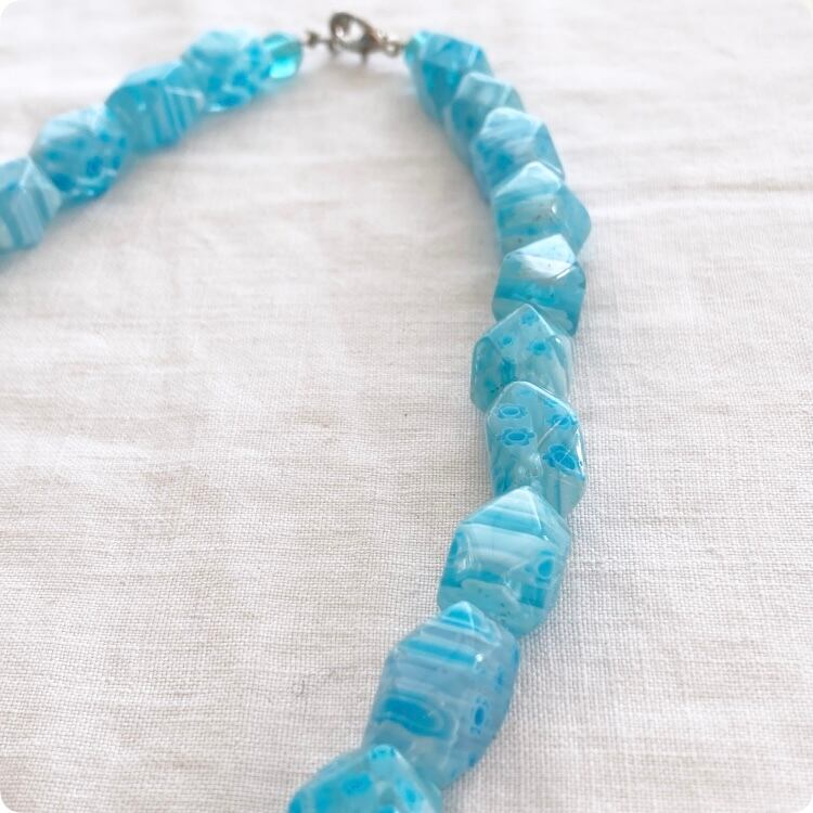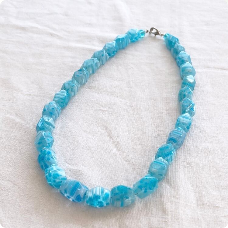 このネックレスは、透明感のあるガラス製ビーズが特徴で、どこか懐かしい独特な質感が感じられます。