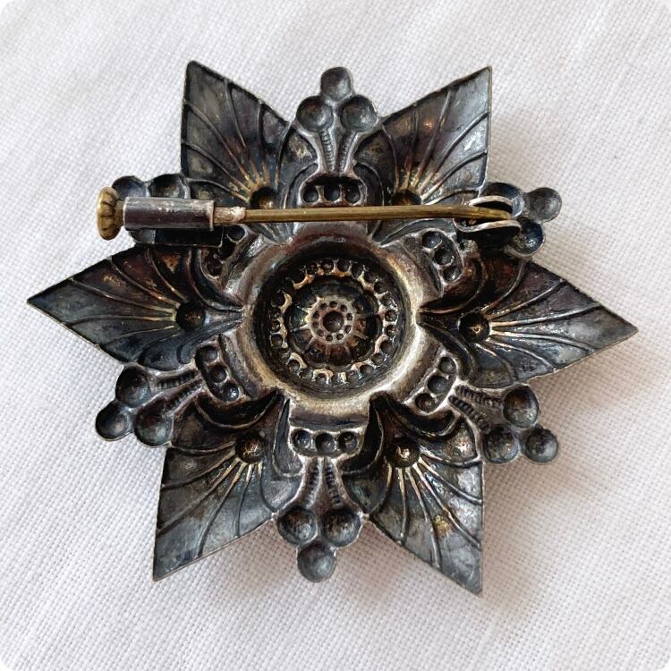 このブローチは、ブラックコーティングの仕上げが施されており、バロック様式のデザインが特徴です。
