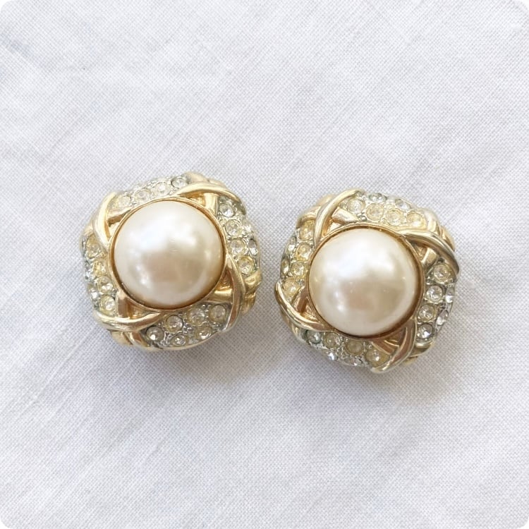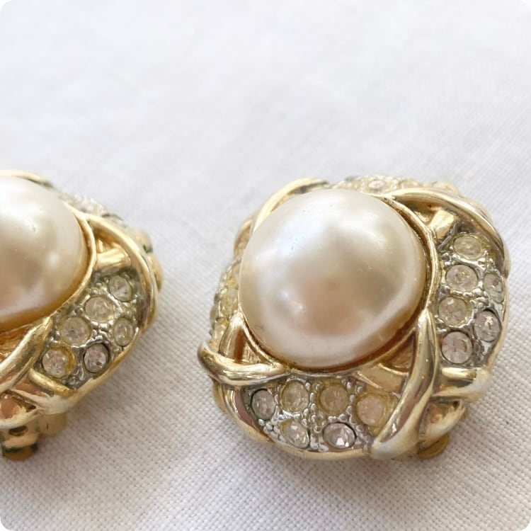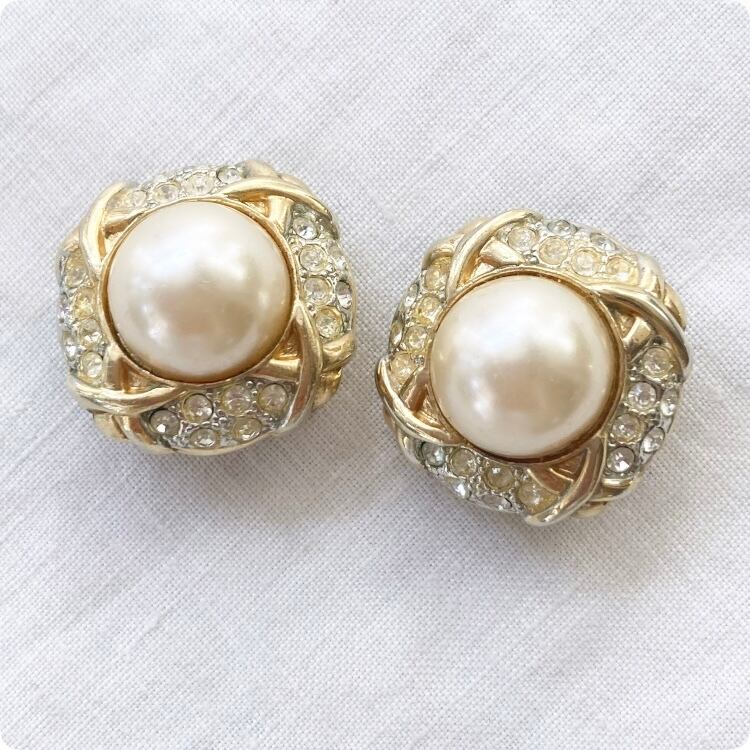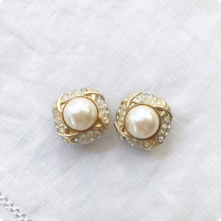 フランスヴィンテージ イヤリング | フェイクパール スクエア型 ラインストーン| 1900年代後半