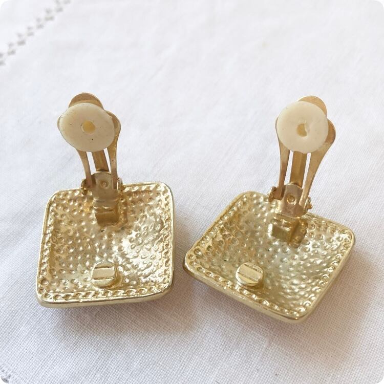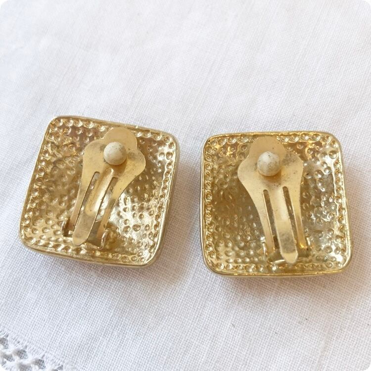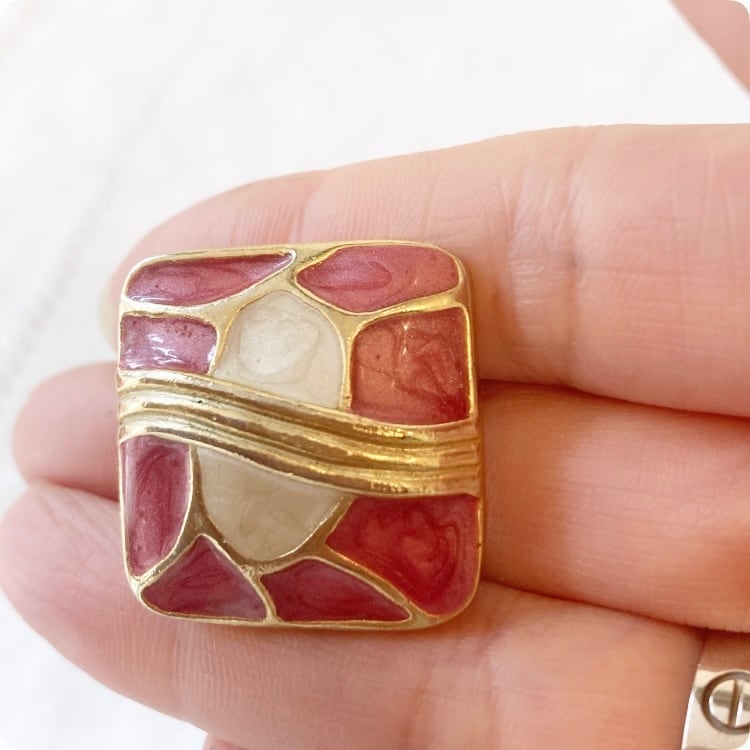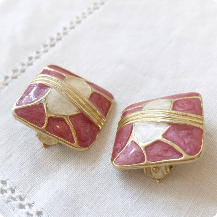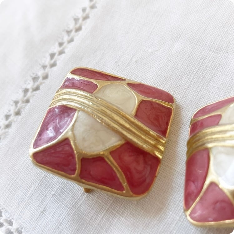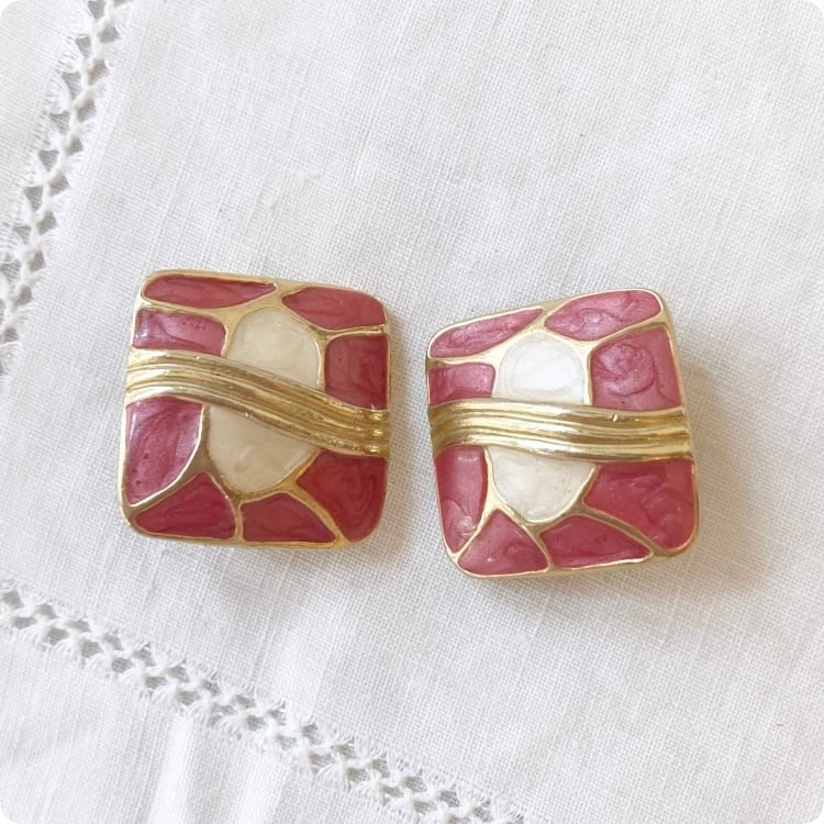 フランスヴィンテージ イヤリング | エナメル ピンクゴールドカラー スクエア型 アールデコ調| 1900年代後半