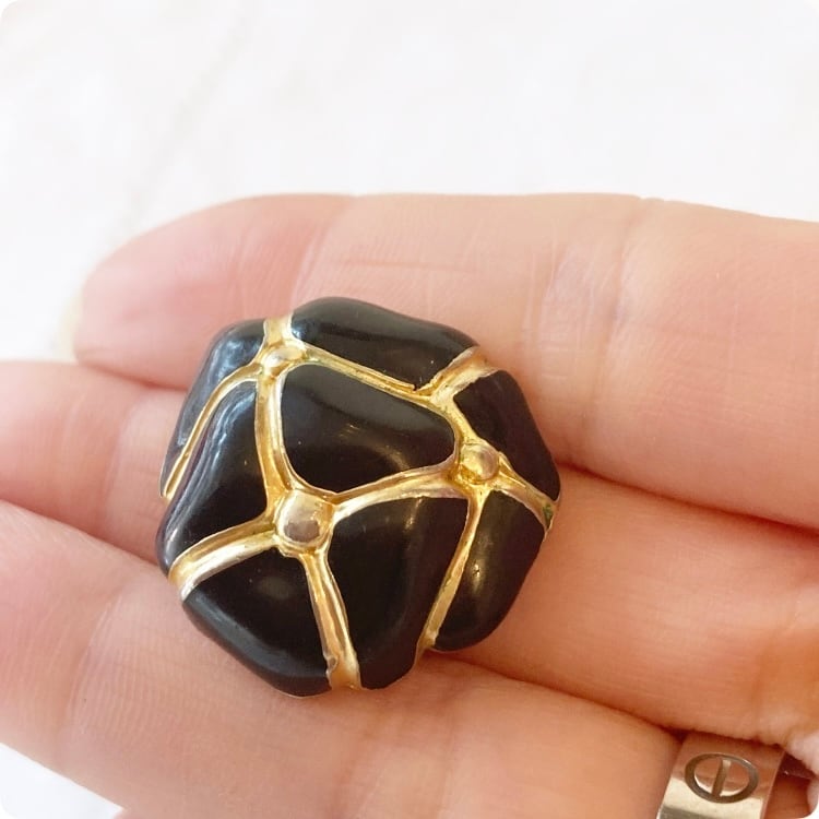 ブラックエナメルとゴールドの幾何学模様が施されており、落ち着いた大人の女性の雰囲気もありながら、でもどこか可愛らしさが漂います。