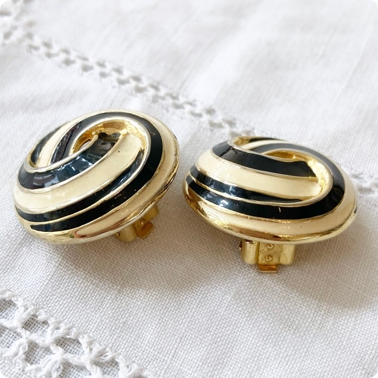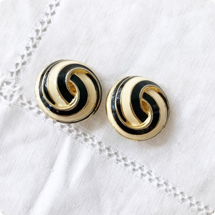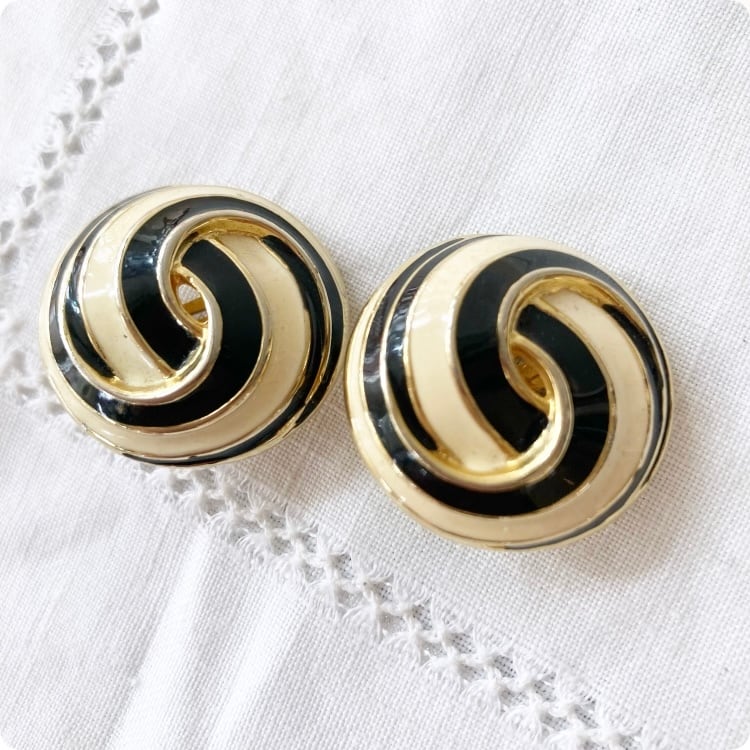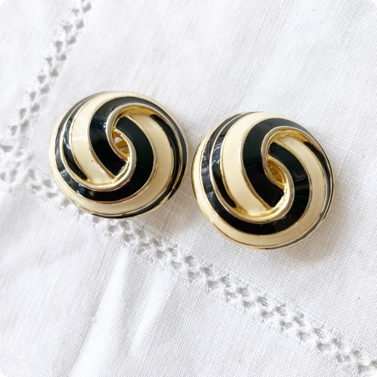 フランスヴィンテージ イヤリング | ブラックエナメル × アイボリー 渦巻状 レトロ | 1980年代頃