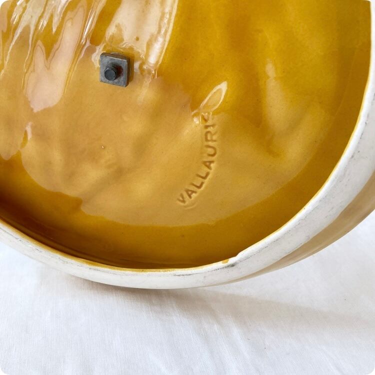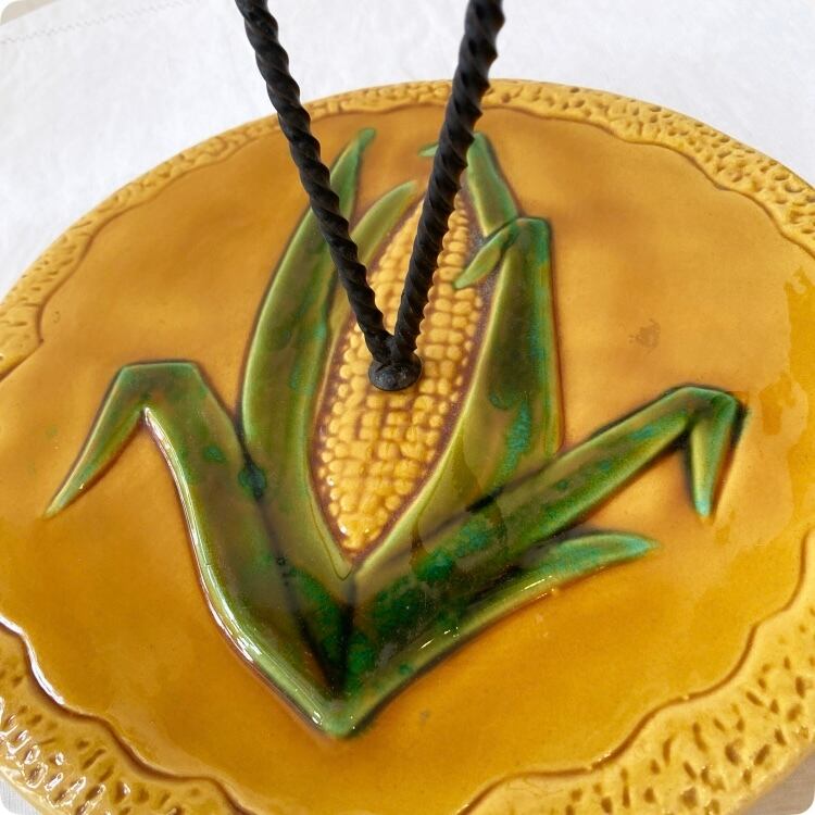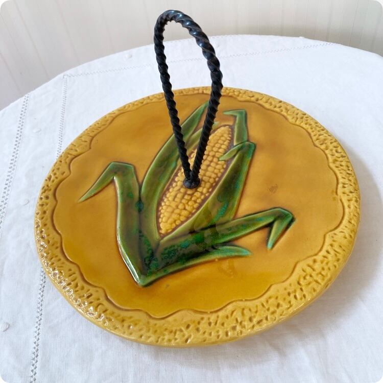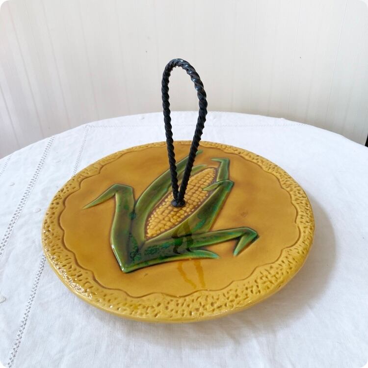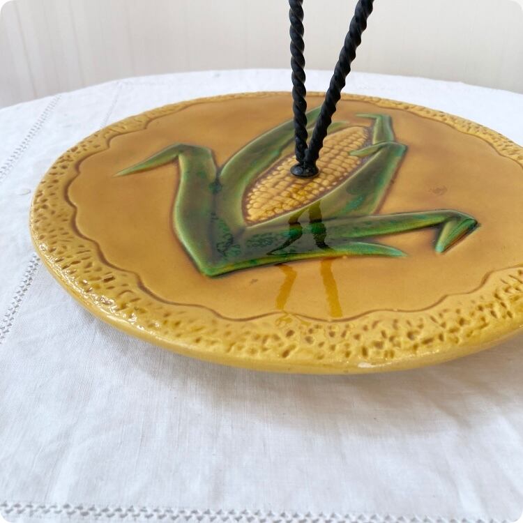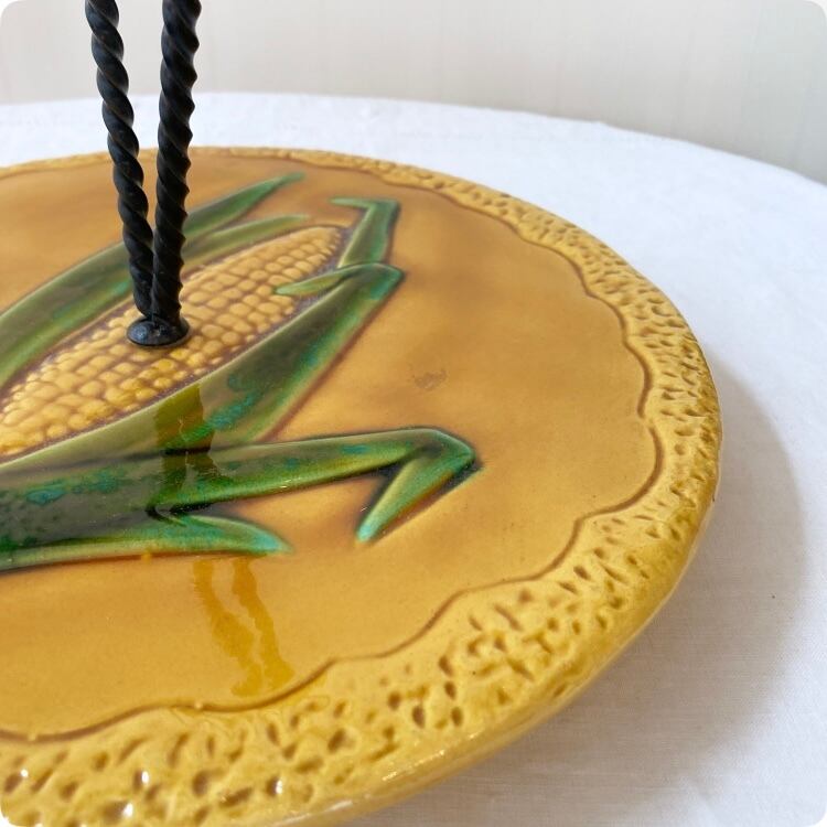 こちらはユニークなトウモロコシのデザインが際立つ、ヴァロリス(Vallauris)焼きのアンティーク陶器製チーズプレートです。
