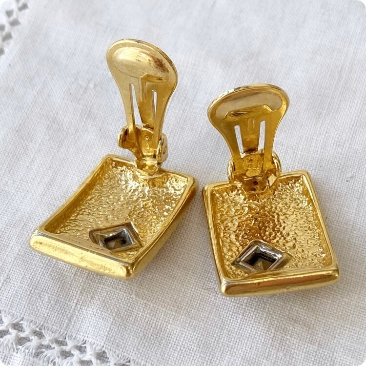 1900年代後半につくられた、フランスヴィンテージの魅力を詰め込んだ、ゴールドカラーのスクエア型イヤリングです。