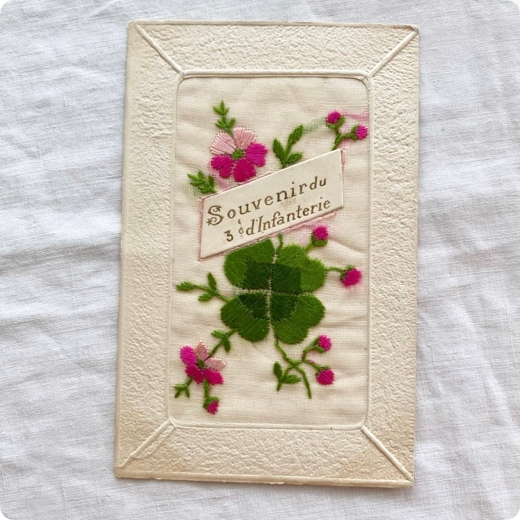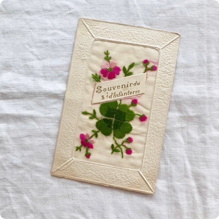 オーガンジー素材のような透け感のある素材に、繊細な刺繍が施されているアンティークポストカードです。
