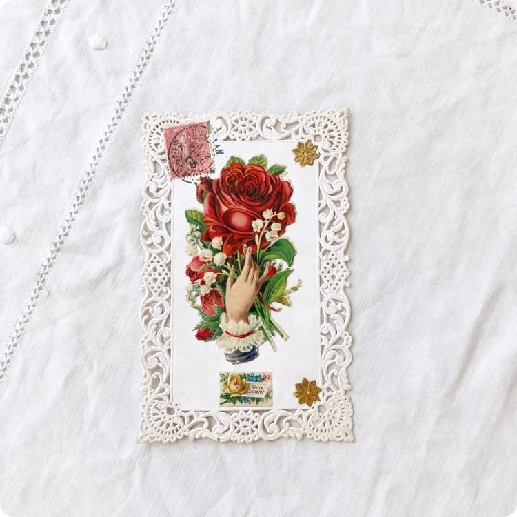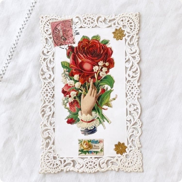 フランスアンティーク ポストカード | 薔薇とスズラン レース柄 「Doux Souvenir」優しい思い出|(Ⅰ006)